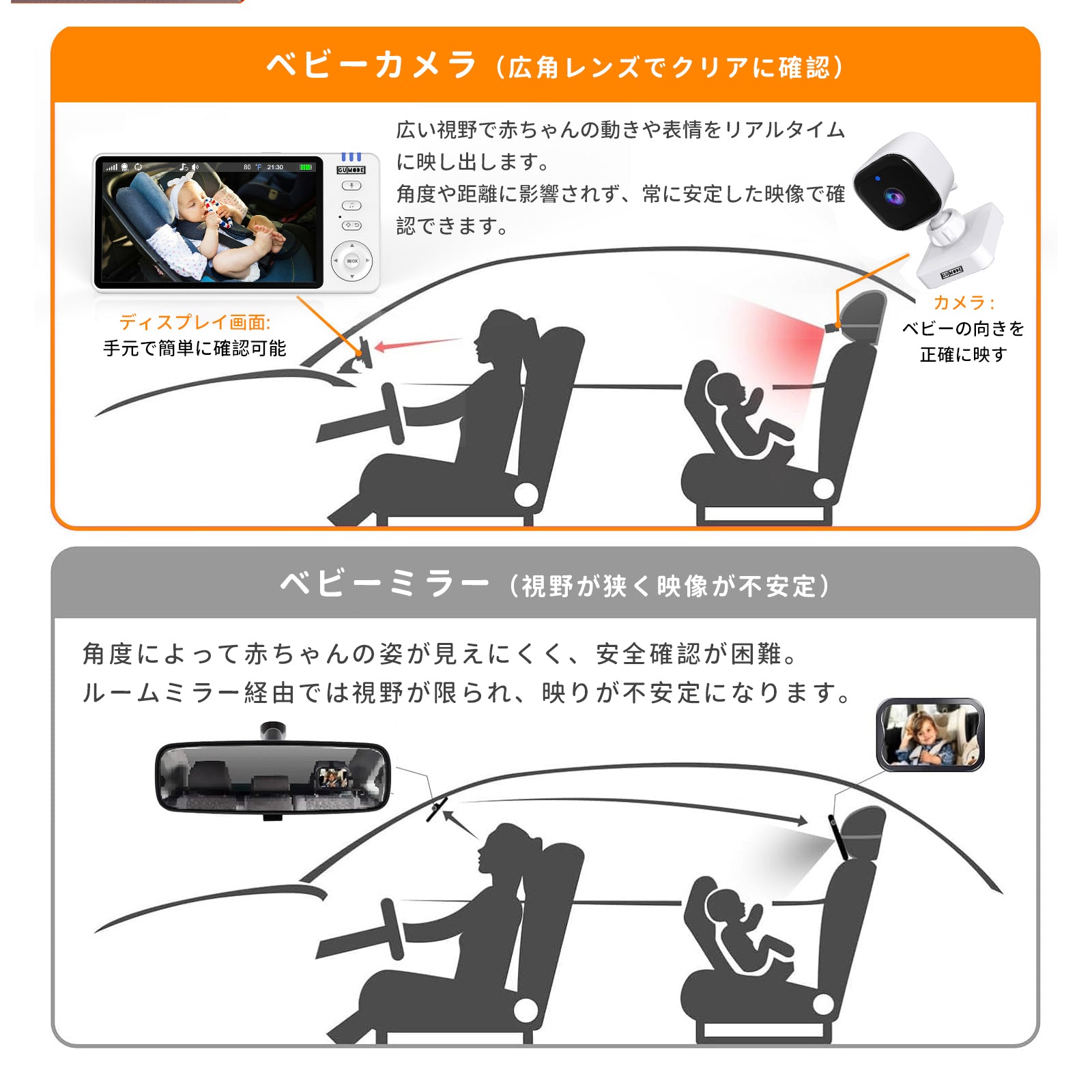 【国内認証取得】ベビーモニター ベビーカメラ 見守りカメラ モニター付き wifi不要 車載&室内2WAY 5インチ大画面 ナイトビジョン 温度警報 VOX 授乳リマインダー 子守唄 トーク機能 bm01 ペットカメラ 出産祝い ギフト 赤ちゃん gumode