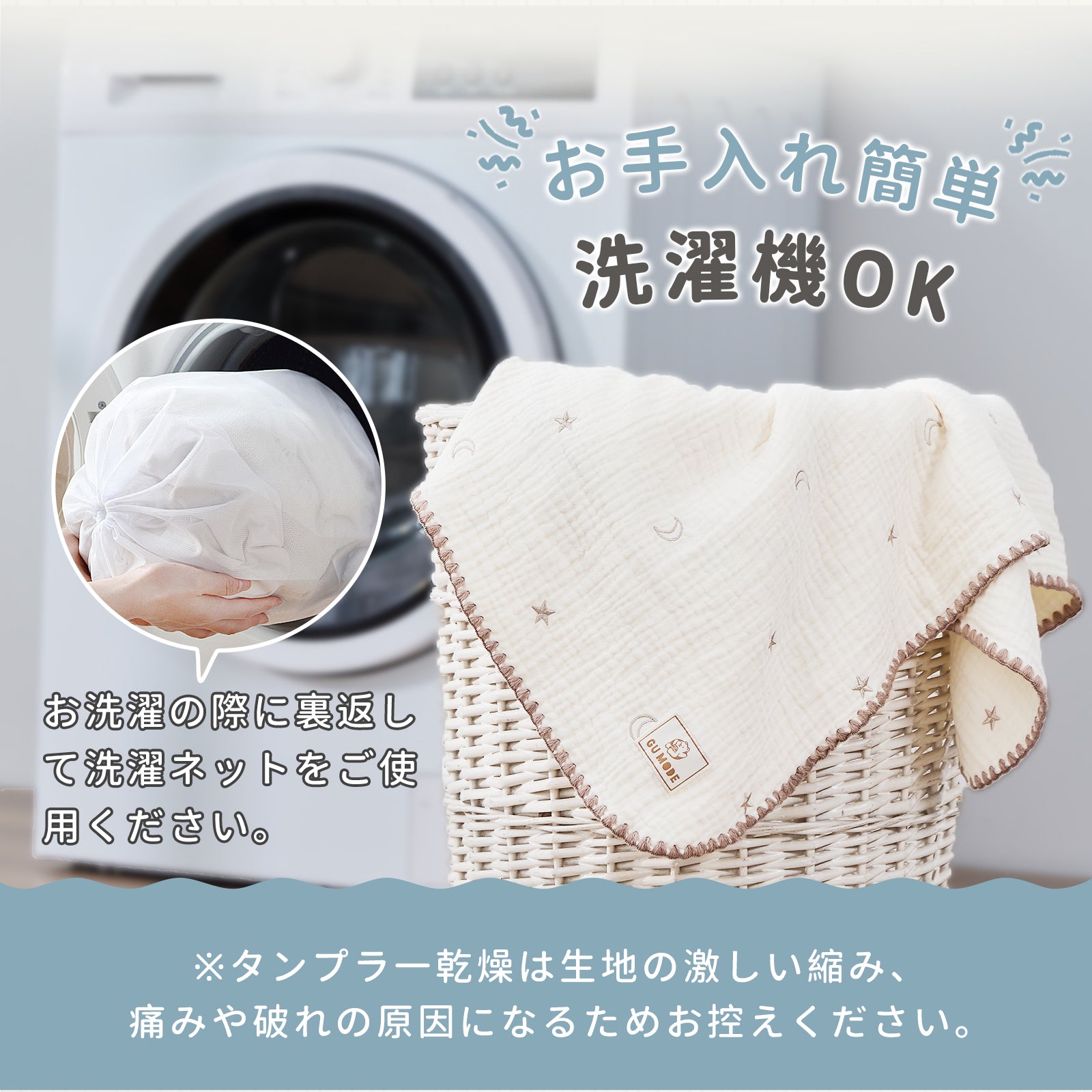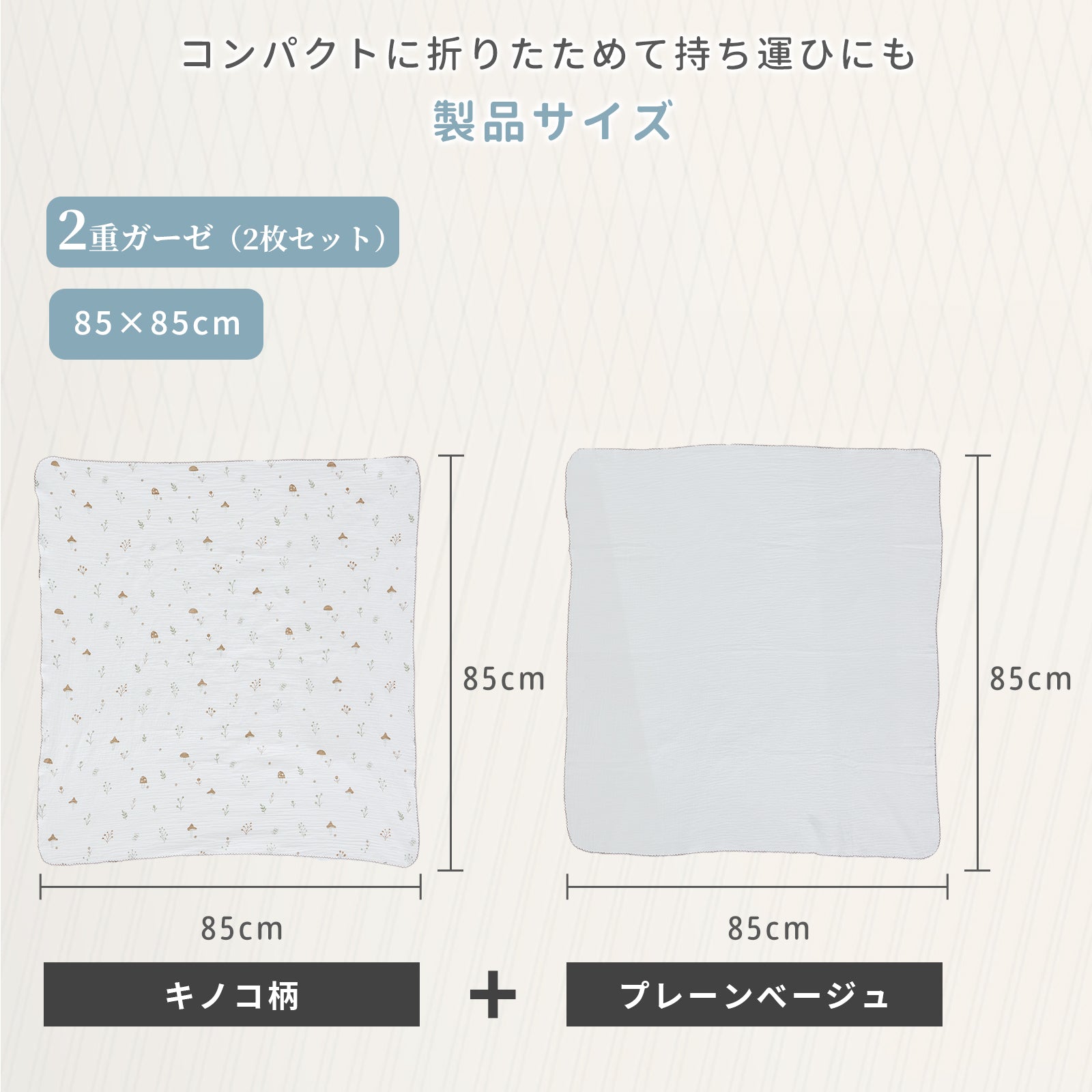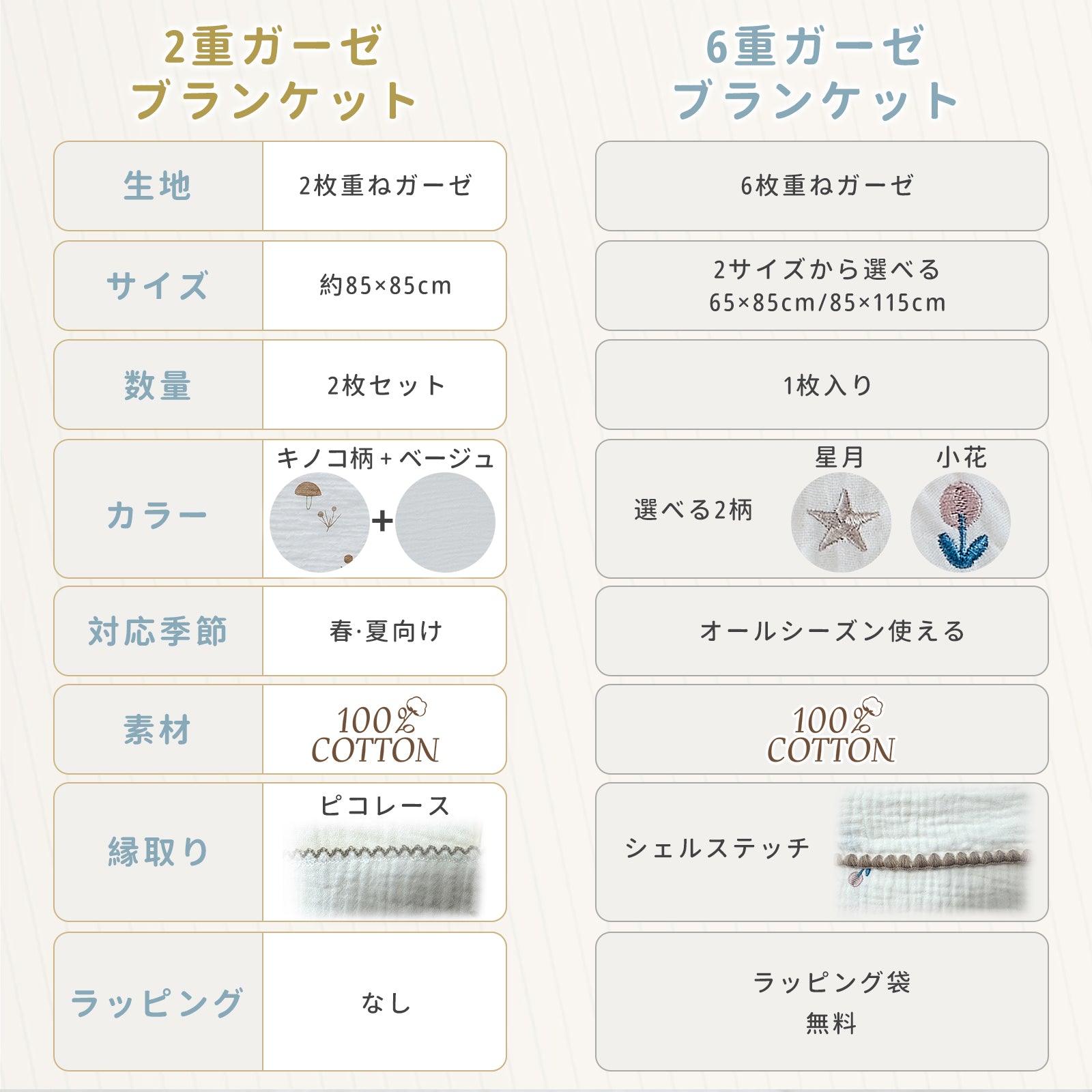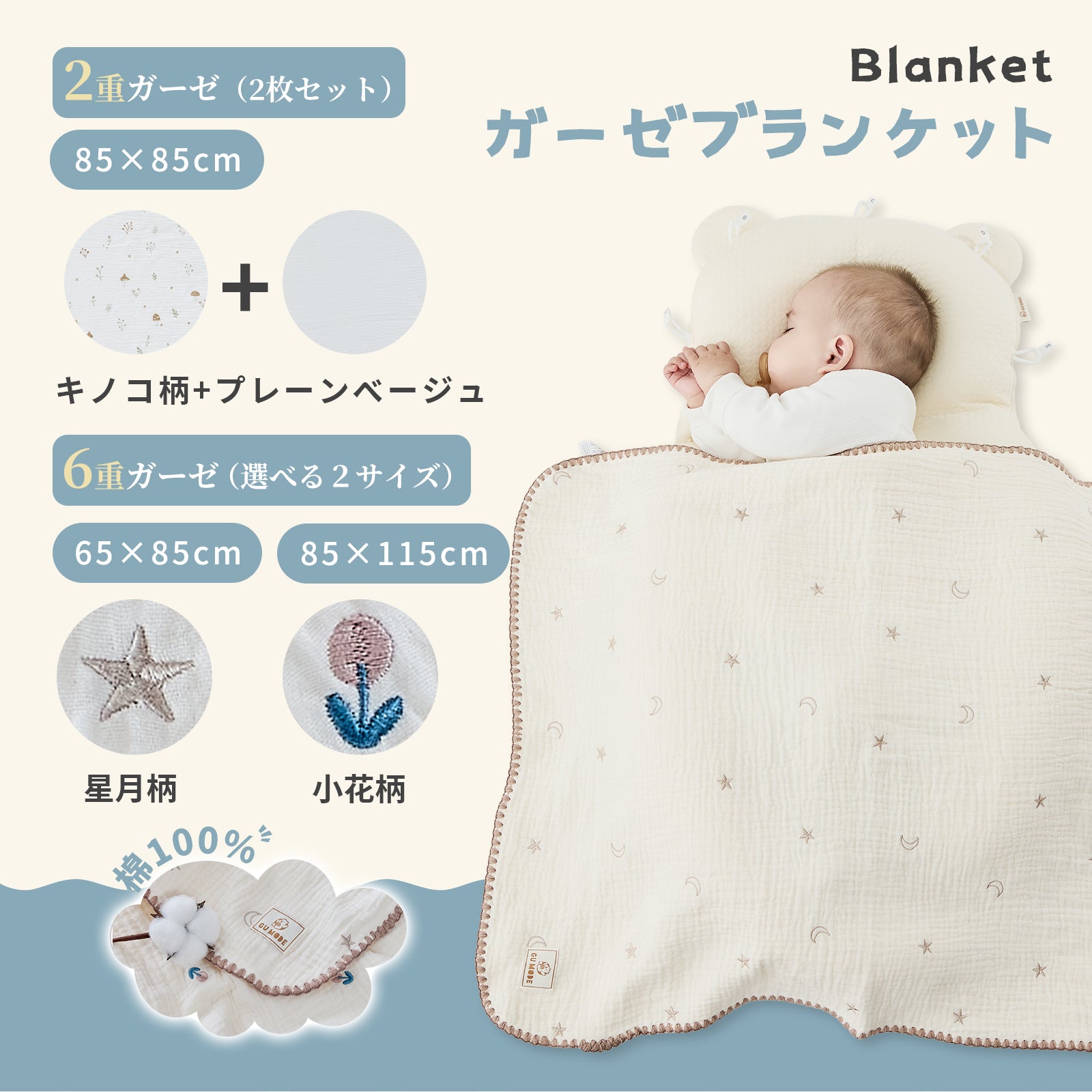 綿100%ガーゼの6重/2重を2枚セットに。通気性と保温性のバランスが良く、丸洗いOKでオールシーズン活躍。出産祝いにもおすすめ。