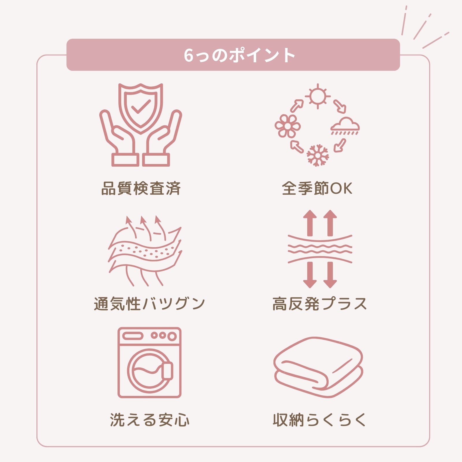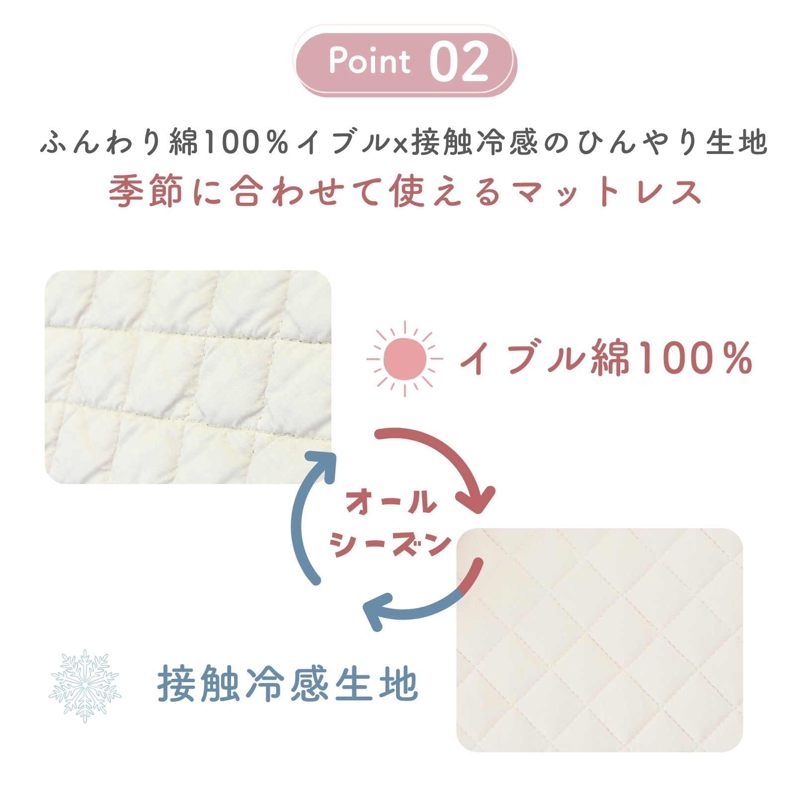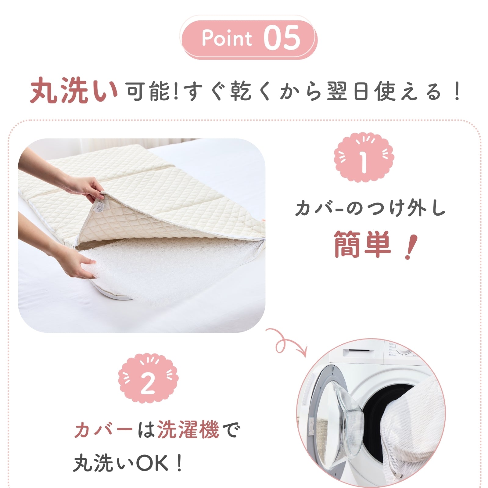 春夏はひんやり冷感、秋冬はふんわりコットン調。1枚で年中使えるリバーシブル高反発マットレス。カバーは洗濯OK、中材もシャワー洗いできて清潔キープ。
